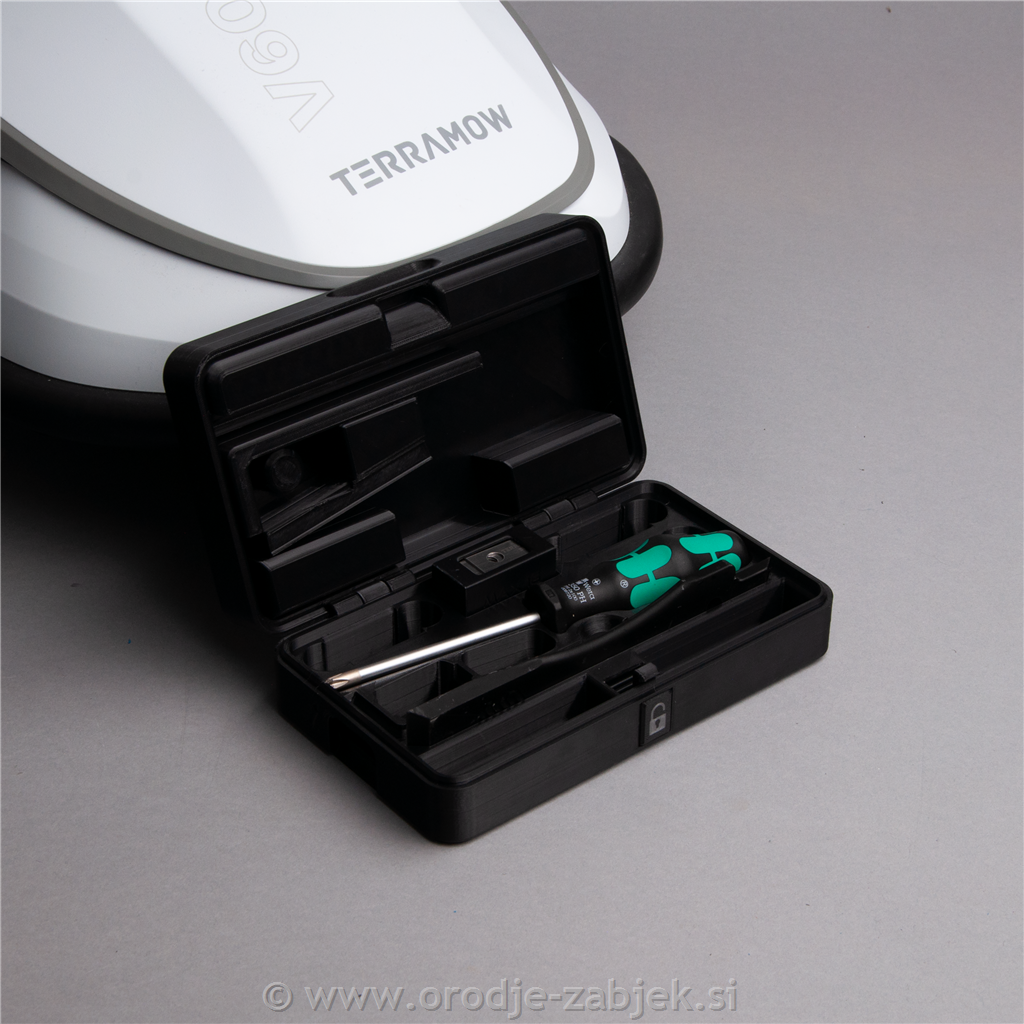 Trpežna servisna škatla za robotske kosilnice Terramow, izdelana iz PETG plastike,